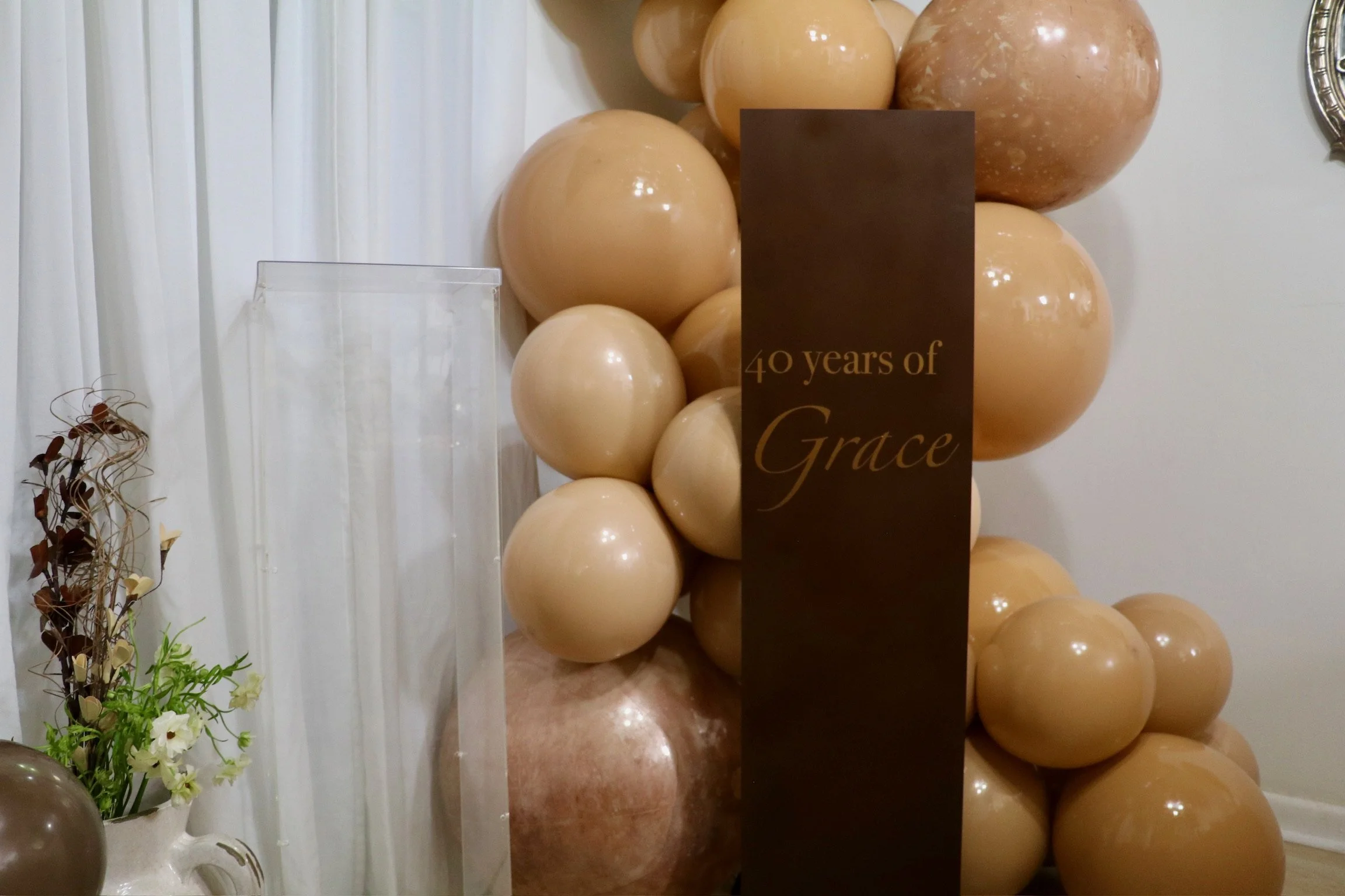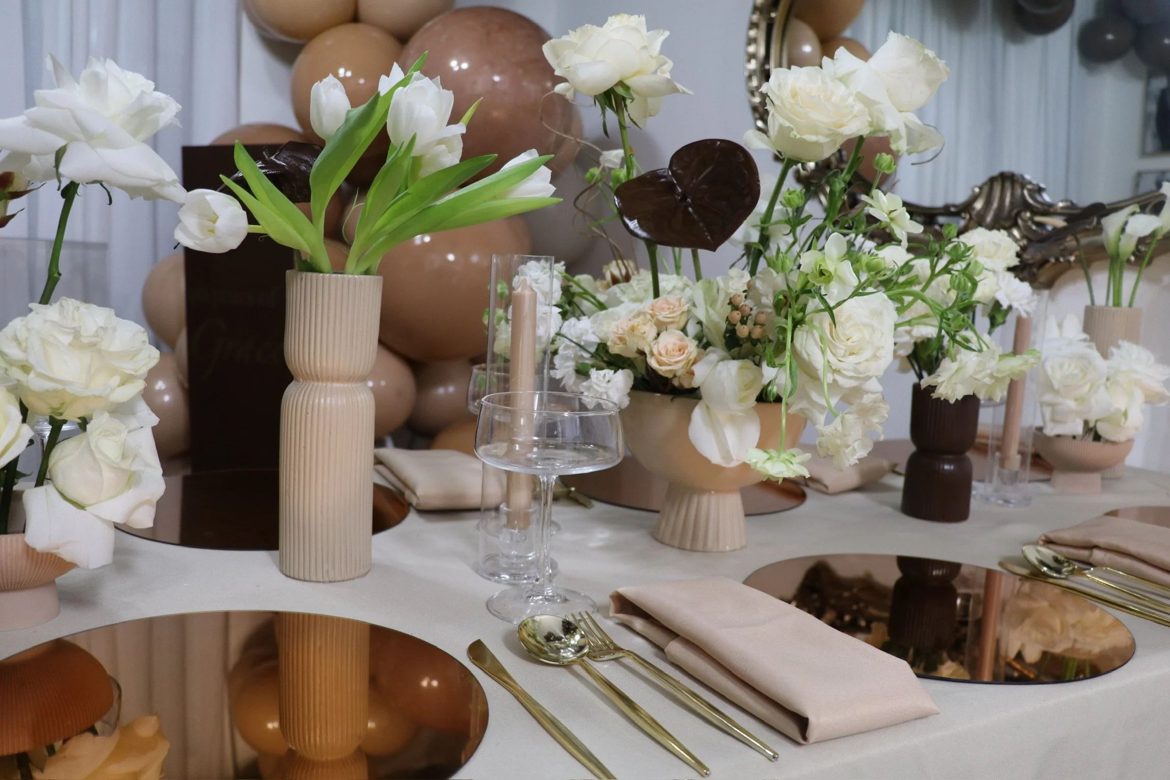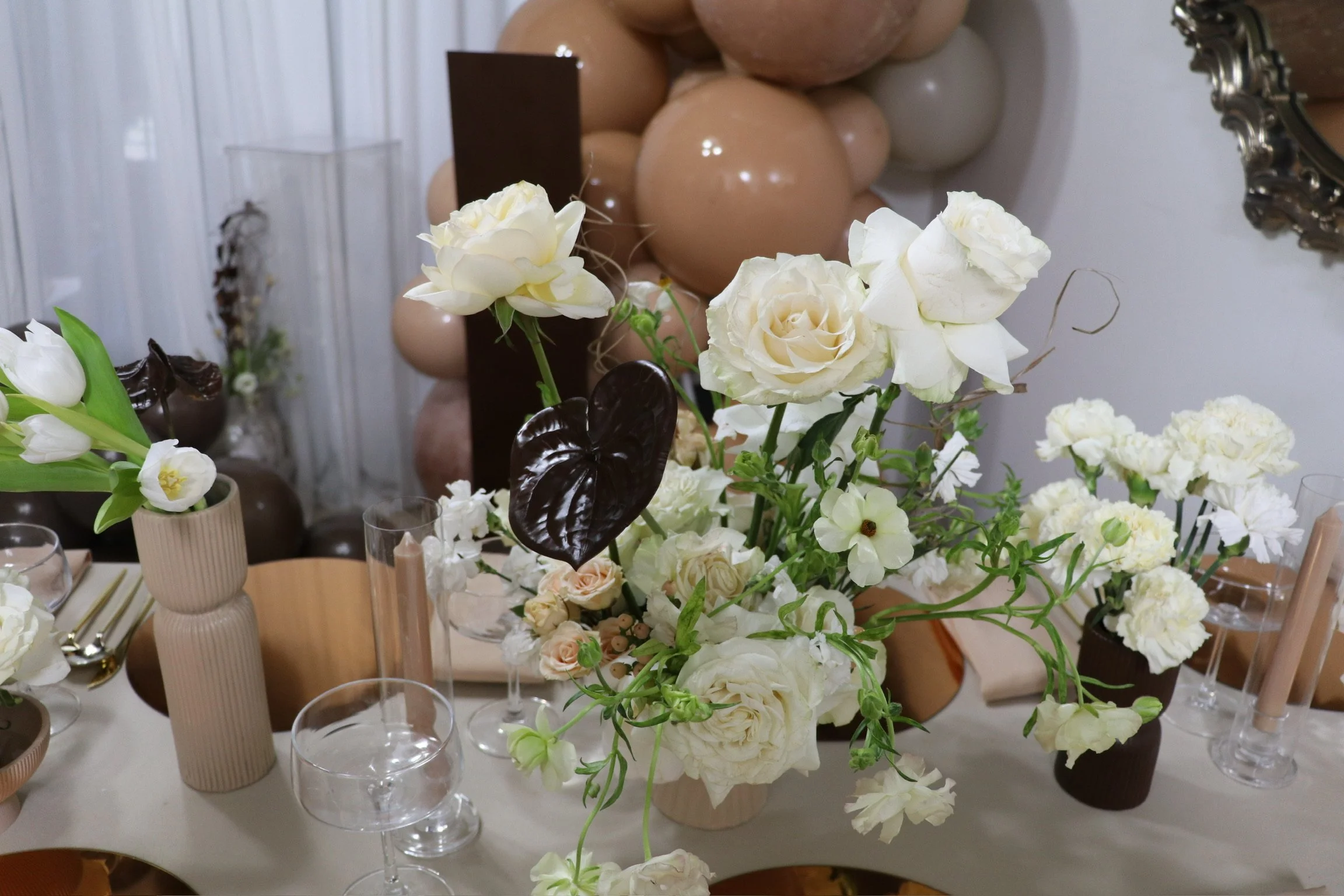 Designer services that include full event design & styling, event planning, backdrop designs, floral arrangements and balloon installations.